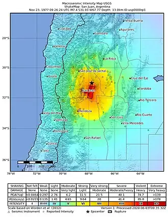 The 1977 San Juan earthquake, also known as Caucete earthquake, took place in the province of San Juan, Argentina, on 23 November at 06:26:26 AM. It measured 7.5 on the moment magnitude scale,[1] and had a maximum perceived intensity of X (Extreme) on the Mercalli intensity scale.