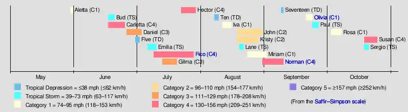 | Carlotta | June 17–25 | Category 4 hurricane | 130 (215) | Unknown | Hawaiian Islands | None | None | [5] | ||
