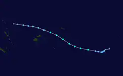 During the opening days of March 1980, a broad trough of low pressure, extended from Vanuatu to Queensland, Australia.[1] A tropical depression subsequently developed, along this trough during March 9, near Rennell Island in the Solomon Islands.[1][2] Over the next few days the system initially moved south-eastwards into the Australian region, as it gradually developed further before it turned south-westwards towards the South Pacific during March 10.[1] The Australian Bureau of Meteorology, subsequently reported that the depression, had developed into a tropical cyclone and named it Sina during March 11.[1] The system subsequently moved south-eastwards and back into the South Pacific basin, where it continued to intensify and move south-eastwards. During March 13, the system peaked as a Category 3 severe tropical cyclone with 10-minute sustained wind speeds estimated at 120 km/h (75 mph), as it passed about 200 km (125 mi) to the southwest of New Caledonia.[1][3] After the system had peaked, it accelerated south-eastwards while gradually weakened and transitioning into a cold cored low.[1][3] The system impacted northern New Zealand during March 15, before it was last noted during the following day.[1][3]