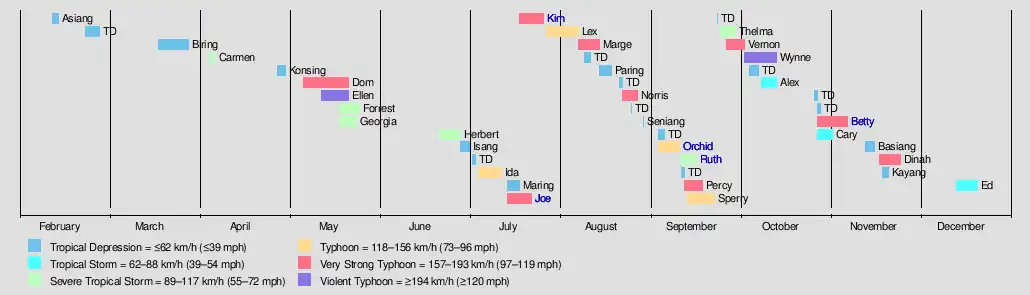 | Kim (Osang) | July 19–27 | Very strong typhoon | 185 km/h (115 mph) | 910 hPa (26.87 inHg) | Philippines, South China, Taiwan | Unknown | 41 | |