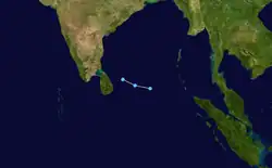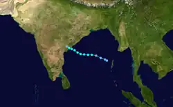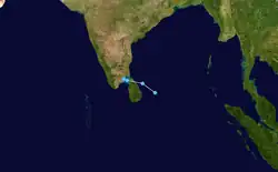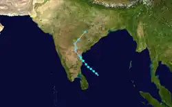 An area of convection south of the previous storm slowly organized into a tropical storm on October 16. It tracked northwestward, reaching a peak of 60 mph winds before hitting southeastern India on the 20th as a weakened 50 mph storm. 60 fatalities can be attributed to this system and 400 huts were damaged.