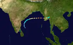 On April 30 the monsoon trough spawned a tropical depression in the western Bay of Bengal. It tracked northeastward, becoming a tropical storm on the 1st and a cyclone on the 2nd. Its movement became more to the east, and the cyclone continued to quickly intensify, reaching a peak of 145 mph winds just before landfall. The small and compact cyclone hit southern Myanmar on the 4th, and it dissipated the next day over land. Moderate to heavy damage was experienced, but advance warning kept the death toll at only five.