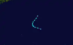 A tropical disturbance first noted east of the Philippines, the system moved through the archipelago as a tropical depression before strengthening briefly to a typhoon in the South China Sea. A combination of northeasterly vertical wind shear and proximity to land weakened the cyclone to a tropical storm before its landfall on Hai-nan and struck Chan Chiang, China as a tropical depression.[9] Winds peaked at 34 knots (63 km/h) at Tate's Cairn in Hong Kong.[1]