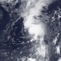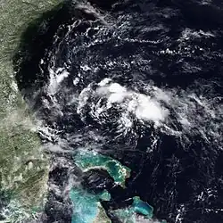 The origins of Tropical Storm Edouard are unclear, but an area of persistent organized storms formed in the Bay of Campeche, which strengthened into a tropical storm on September 14. Edouard rapidly intensified, with wind speeds reaching 65 miles per hour (105 km/h) in 18 hours as a faint eye feature became visible. Following its strengthening, Edouard dissipated even more quickly, degenerating into an area of thunderstorms the next day.[36] The remnants of Edouard moved over land near the port of Veracruz.[37]