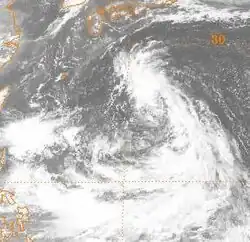 Convection formed in the eastern end of the monsoon trough just north of Guam on August 20, leading to the formation of a weak low-pressure area by late morning August 21. The system slowly consolidated as it moved northwest, and was separating from the monsoon trough on August 23. Although convection increased in organization, the surface wind field did not respond. Nevertheless, it was deemed a tropical depression on the morning of August 24. By the next morning, the surface circulation became exposed as upper-level conditions worsened due to strong southerlies aloft. The cyclone was no longer deemed tropical at that time. The surface cyclone moved northwest, crossing the Ryūkyū Islands before it merged with a frontal zone in the northern East China Sea late on August 26.[14]