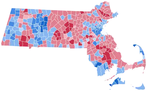 As of 2024, this was the last time that the cities of Amesbury, Attleboro, Beverly, Braintree, Brockton, Franklin, Leominster, Marlborough, and Methuen and the towns of Abington, Alford, Auburn, Avon, Ayer, Barnstable, Bedford, Bernardston, Bolton, Boxborough, Buckland, Burlington, Canton, Carlisle, Charlemont, Chelmsford, Clinton, Cummington, Danvers, Dedham, Dennis, Erving, Essex Gosnold, Grafton, Groton, Hancock, Harvard, Harwich, Hawley, Holbrook, Holliston, Hopedale, Hudson, Ipswich, Littleton, Longmeadow, Manchester-by-the-Sea, Mansfield, Marblehead, Marion, Mattapoisett, Medway, Milton, Mount Washington, Needham, New Ashford, New Salem, Newbury, Northborough, Norton, Peru, Petersham, Plymouth, Reading, Savoy, Sheffield, Shelburne, Shirley, Shrewsbury, Southborough, Southampton, Stow, Sudbury, Wakefield, Wellesley, West Newbury, Westborough, Westford, Westhampton, Weston, Winchester, Windsor, and Yarmouth voted Republican.