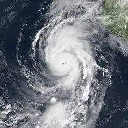 On November 7, an area of convection associated with a tropical wave developed into a tropical depression, while located about 560 mi (900 km) to the southeast of Acapulco, Mexico.[42] During that day the depression moved towards the northwest, intensified into a tropical storm and was named Nora later that day.[43][44] On the next day, the storm gradually intensified further while temporarily moving towards the west, due to the flow field around a strengthening high pressure system located to the north of Nora.[1] After developing an eye, Nora intensified into a hurricane.[42][45]
