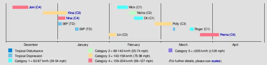 | Nina | January 1 – 5 | Category 4 severe tropical cyclone | 165 km/h (105 mph) | 960 hPa (28.35 inHg) | Queensland, Solomon Islands, Wallis and Futuna, Rotuma, Tonga | $110 million | 26 | [10] |