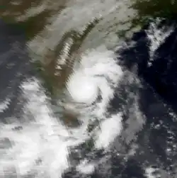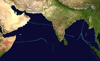 After the annual monsoon moved across India, a thermal low developed in early June over Maharashtra in west-central India. Steered by the flow of the monsoon, the low moved offshore and tracked generally west-northwestward, bringing heavy rainfall and gusty winds to the coast. Ratnagiri, Maharashtra reported sustained winds of 74 km/h (46 mph). The IMD classified the low as a depression late on June 5, and upgraded it further to a cyclonic storm the next day. On June 7, the JTWC initiated advisories on the system, designating it Tropical Cyclone 03A and estimating peak winds of 85 km/h (55 mph). On the same day, the IMD upgraded the system to a severe cyclonic storm, estimating peak winds of 100 km/h (60 mph). The storm weakened as it continued across the northern Arabian Sea. By June 9, the storm had weakened to a depression, and that day it passed near Masirah Island before moving over eastern Oman. The circulation dissipated soon after, but the remnants of the storm continued westward into Yemen. Along the Arabian Peninsula, the cyclone produced dust storms but little rainfall.[1][2][5]