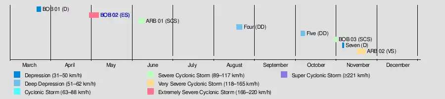 BOB 02 April 26 – May 2 Extremely Severe Cyclonic Storm 215 km/h (135 mph) 940 hPa (27.76 inHg) Bangladesh, Myanmar 125 million 350