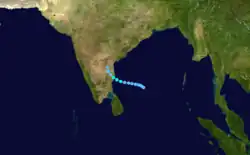 A low-pressure area formed over the western Bay of Bengal on October 28. On the next day, the IMD classified it as a depression, and soon upgraded it to a deep depression. On October 30, the IMD upgraded it further to a cyclonic storm and later a severe cyclonic storm, estimating peak 3–minute winds of 110 km/h (70 mph); this was based on the appearance of a well-defined eye. Also on October 30, the JTWC initiated advisories on the system as Tropical Cyclone 04B north of Sri Lanka. The storm consisted of a consolidating area of thunderstorms, with spiral rainbands. Steered by a ridge to the north, the system moved west-northwestward toward the southeast coast of India. Early on October 31, the storm made landfall in southeastern India near Chennai with winds of 110 km/h (70 mph), according to the IMD, and 85 km/h (55 mph) according to the JTWC. Late on October 31, the storm fell below depression status after weakening over land.[2][1]