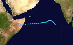 The JTWC began monitoring an area of thunderstorms on November 13 in the south-central Arabian Sea. A day later, the system organized into a low-pressure area, before developing into a depression on November 15, as classified by the IMD. On the same day, the JTWC classified the system as Tropical Cyclone 05A. The system moved slowly at first before beginning a general westward motion, steered by a ridge to the north. Convection organized around the center, signaling intensification. On November 16, the IMD upgraded the depression to a deep depression, and later cyclonic storm. The storm fluctuated in intensity until November 18, when a more pronounced strengthening trend began. A day later, the IMD upgraded the storm to a very severe cyclonic storm, estimating 3 minute winds of 120 km/h (75 mph), based on a Dvorak rating of 4.0. The JTWC meanwhile estimated peak 1 minute winds of 110 km/h (70 mph). The storm weakened significantly as it approached the Horn of Africa. On November 20, the storm made landfall in eastern Somalia near Eyl. The storm rapidly dissipated over land.[1][2]
