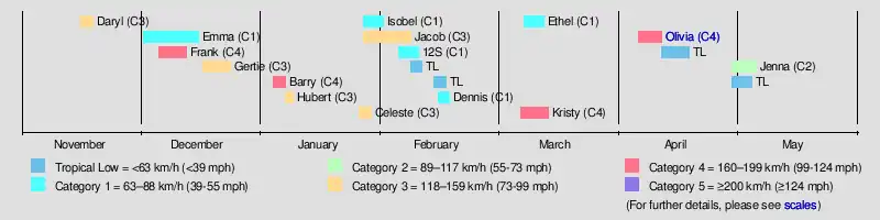| Emma | 2 – 16 December 1995 | Category 1 tropical cyclone | 75 km/h (45 mph) | 990 hPa (29.23 inHg) | Christmas Island | Minor | None | [8] |