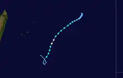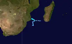 The same monsoon trough that spawned Connie also produced an area of convection southeast of Diego Garcia on January 28. The circulation slowly organized, and the MFR classified it as a tropical disturbance on January 30. A nearby trough steered the system southeastward initially and later to the southwest. On January 31, the system became a tropical depression, and later Moderate Tropical Storm Damienne the next day, reaching peak winds of 65 km/h (40 mph).[3] Also on February 1, the JTWC initiated warnings on Tropical Cyclone 10S, which estimated 1‑minute winds of 95 km/h (59 mph).[13] Increased wind shear removed the convection on February 2, causing marked weakening,[3] and prompting the JTWC to discontinue advisories that day. This was despite forecasts of strengthening to near tropical cyclone status.[13] As a weak tropical disturbance, Damienne turned to a rapid westward motion, passing north of Rodrigues and Tromelin. The circulation dissipated on February 7 off the northeast coast of Madagascar.[3]