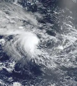 Toward the end of February, the ITCZ produced a large area of convection in the eastern portion of the basin which would spawn two disturbances.[3] On February 29, Tropical Disturbance 9 formed within the system well to the southeast of Diego Garcia.[53] The convection organized slightly despite easterly wind shear, which left the circulation exposed.[3] On March 1, the JTWC classified it as Tropical Cyclone 17S,[54] estimating winds of tropical storm force the next day.[53] The MFR, by contrast, classified it as a tropical depression while moving generally southwestward. The convection weakened on March 3 due to the wind shear, and the circulation steered more to the west-northwest. After nearly dissipating on March 5, the thunderstorms reorganized, possibly due to influence from the monsoon. It turned back to the east, possibly due to interaction with the approaching Cyclone Norman in the Australian basin. Convection soon after diminished over the depression, and the system dissipated on March 11 near 90°E.[3]