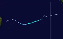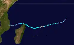 On February 1, a low-pressure area formed within the monsoon trough to the south of Indonesia, which would eventually become Tropical Cyclone Leon in the Australian basin,[3] as well as Tropical Cyclone 11S according to JTWC.[13] The storm tracked westward across much of the Indian Ocean, fluctuating in strength due to changes in the atmosphere. After crossing 90° E, the MFR began tracking the system as Tropical Storm Eline on February 8. The storm continued westward across the Indian Ocean and intensified greatly as it approached the east coast of Madagascar. Late on February 17, Eline made landfall near Mahanoro with 10‑minute winds of 165 km/h (103 mph), making it the strongest storm to hit the country in several decades. The storm rapidly weakened over land, but restrengthened in the Mozambique Channel to reach peak 10‑minute winds of 185 km/h (115 mph). On February 22, Eline made landfall about 80 km (50 mi) south of Beira, Mozambique near peak intensity and quickly weakened over land. The well-defined circulation moved across southern African, finally dissipating over eastern Namibia on February 29. Throughout its duration, Leon–Eline lasted 29 days, a record longevity for a storm in the south-west Indian Ocean. The track was over 11,000 km (6,800 mi), or about 25% of the Earth's circumference.[3]