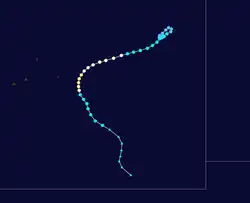 Around the time of peak intensity, Babiola began turning more to the south due to an approaching trough. Late on January 9, the cyclone passed about 400 km (250 mi) east of Rodrigues. Increased shear weakened the eyewall and convection,[3] and Babiola weakened below cyclone status on January 11.[9] Early the next day, the JTWC discontinued advisories as the storm was beginning to become extratropical.[8][9] The MFR followed suit later on January 12, although the agency continued to track Babiola. The storm shifted south-southwestward on January 13 before resuming its southeast trajectory, influenced by a ridge to the south. On January 14, the remnants of Babiola passed just west of Île Amsterdam, where gusts reached 90 km/h (56 mph). Later that day, the storm merged with the trough that had originally turned it to the southeast.[3]