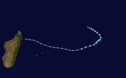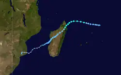 On December 23, a circulation with accompanying convection became evident about 400 km (250 mi) southeast of Diego Garcia,[3] becoming a tropical disturbance.[6] While moving to the south, the thunderstorms organized more,[3] aided by low wind shear, good outflow, warm waters, and its position beneath an anticyclone.[7] Curving west-southwestward due to a ridge to the south, the system intensified into a tropical depression and later Tropical Storm Astride on December 25.[6] That day, the JTWC classified the system as Tropical Cyclone 03S.[7] The storm developed a large area of convection, prompting the MFR to upgrade it to a severe tropical storm on December 26,[3] estimating 10‑minute winds of 95 km/h (59 mph).[6] On December 27, the JTWC upgraded Astride to the equivalent of a minimal hurricane due to the appearance of an eye feature, estimating 1‑minute winds of 120 km/h (75 mph).[6] Later that day, the storm weakened unexpectedly, perhaps related to wind shear from a trough to the south. The convection deteriorated markedly, and the weakening storm turned more to the west-northwest on December 29 due to a weaker ridge. Convection reorganized slightly, although it was dislocated from the center. Early on December 30, the storm passed about 70 km (43 mi) northeast of Tromelin Island. Curving back to the west, Astride struck northeastern Madagascar between Vohemar and Antsiranana on December 31 as a minimal tropical storm. It emerged into the Mozambique Channel as a tropical depression, and despite forecasts to the contrary, it reintensified into a tropical storm before passing near Mayotte on January 2. Early the next day, Astride weakened back to tropical depression status before moving ashore eastern Mozambique near Pemba, dissipating soon after.[3]