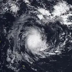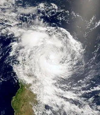 Late on February 22, the JTWC upgraded the storm to the equivalent of a minimal hurricane, while the MFR estimated peak 10‑minute winds of 110 km/h (68 mph).[38] This was based on a 100 km (62 mi) wide eye feature that had developed in the storm's center. Around the time of peak intensity, Felicia passed about 500 km (310 mi) southeast of Rodrigues. The interaction of the trough and a ridge to the east increased wind shear, causing the storm to weaken. On February 24, the storm became extratropical while still maintaining a well-defined circulation. It slowed and looped back to the northwest due to a ridge to the south, gradually becoming less defined and dissipating on February 26.[3]