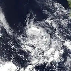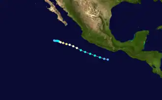 A tropical wave moved off the coast of western Africa into the Atlantic Ocean on August 29. It continued to move westward through the tropical waters of the Atlantic into the Caribbean. It still remained a tropical wave as it moved over Central America and began to acquire more convection and organization, from September 10 through September 11. Visible satellite imagery showed low level circulation and more organized deep convection as it became a tropical depression on September 17, while located about 475 miles (764 km) south-southeast of the southern tip of the Baja California Peninsula.[30]