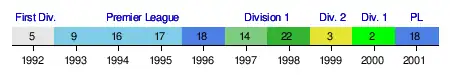 Prior to this season, the history of Manchester City's performance in the English football league hierarchy since the creation of the Premier League in 1992 is summarised by the following timeline chart – which commences with the last season (1991–92) of the old Football League First Division (from which the Premier League was formed).
