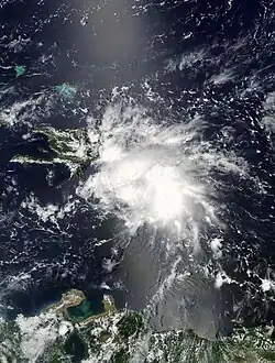 A tropical wave moved westward off the coast of Africa on July 14.[44] After tracking steadily westward, an area of thunderstorms became more concentrated as its upper-level environment became more favorable,[45] and late on July 19 the National Hurricane Center classified it as Tropical Depression Six while it was located about 1,035 miles (1,666 km) east of the Lesser Antilles.[44] Upon being classified as a tropical cyclone, the depression maintained two ill-defined hooking bands to its north and south, and was originally forecast to attain hurricane status before passing through the Lesser Antilles. With warm waters and very light wind shear forecast, its environmental conditions met four out of five parameters for rapid intensification.[46] Subsequently, convection diminished as the result of cold air inflow and instability from a disturbance to its southeast.[47]
