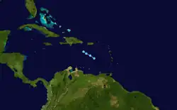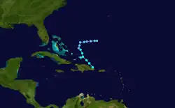 Initially, the depression was forecast to attain tropical storm status, maintaining good outflow and some banding features around the system.[30] Around 09:00 UTC on June 11, satellite-based intensity estimates indicated the depression was near tropical storm status.[34] However, the convection subsequently diminished and became displaced to the northeast of the center, and late on June 11 the depression degenerated into an open tropical wave about 950 miles (1,530 km) east-southeast of Barbados.[27] The tropical wave remained well defined with a well-defined low-level vorticity, though strong wind shear prevented tropical redevelopment.[35] On June 13 its remnants passed through the Windward Islands and subsequently entered the Caribbean.[36]