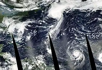 Three simultaneous tropical cyclones on September 7, Henri (left), Fabian (center) and Isabel (right).