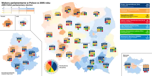 Parliamentary elections were held in Poland on 25 September 2005. All 460 members of the Sejm and 100 senators of the Senate were elected. The election resulted in a sweeping victory for two opposition parties: the right-wing, national-conservative Law and Justice (PiS) and the centre-right, liberal-conservative Civic Platform (PO). The incumbent centre-left government of the Democratic Left Alliance (SLD) was soundly defeated. PiS won 155 seats and PO 133, while the governing SLD was reduced to fourth place with 55 seats, behind Andrzej Lepper's Self-Defence party, which won 56 seats.