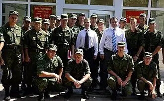 In September 2006, Georgian law enforcement detained 10 Georgian citizens and four Russian GRU officers in Tbilisi over espionage charges, causing a diplomatic crisis and Russia recalling its ambassador from Georgia.[11] Days later, the Georgian police besieged the Russian military headquarters in Tbilisi in search of alleged suspects involved in a 2005 terrorist attack in Gori. In response, Abkhaz and South Ossetian separatist leaders Sergei Baghapsh and Eduard Kokoity were invited to meet with Putin in Russia, while the latter imposed a travel ban to and from Georgia. The 2006 espionage controversy led to an anti-Georgian campaign in Moscow, with local police launching raids on Georgian-owned businesses, the withdrawal of Georgian-origin students from public schools, and the mass deportation of Georgian migrants from Russia, leading to three deaths in the process.[12] British expert Mark Galeotti believes that Russia drew up plans to remove Saakashvili from power in 2006, when the North Caucasus Military District began staging increasingly elaborate and large military exercises,[13] while Putin later admitted he had ordered the General staff of the Russian Armed Forces to draw up plans for an invasion of Georgia following the espionage scandal.[14]