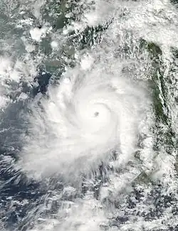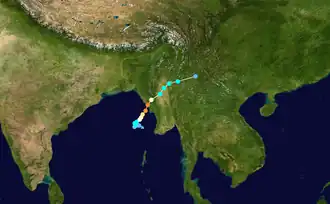 On October 19, an area of low pressure formed in the Bay of Bengal.[39] During the next day, the India Meteorological Department (IMD) upgraded the area of low pressure to a depression giving it the designation "BOB 04". At that time it was located approximately 250 kilometres (160 mi) southwest of Sittwe, Myanmar.[40] Early on October 21, the IMD upgraded Depression BOB 04 to a deep depression.[41] That day, the Joint Typhoon Warning Center (JTWC) designated the system as Tropical Cyclone 04B.[42] Later, the deep depression strengthened further and was upgraded to a cyclonic storm and named "Giri" by the IMD.[43] Early on October 22, the IMD upgraded the storm to a Very Severe Cyclonic Storm.[44] The cyclone had intensified to a Category 4 tropical cyclone on the SSHS according to the JTWC.[45] Late on the same day, the IMD reported that the system had grown stronger than Cyclone Phet, becoming the most powerful storm of the season.[46] According to the news, the cyclone made landfall late on October 22, at Kyaukphyu, Arakan, Myanmar.[47] Late on October 22, Giri weakened into a Severe Cyclonic Storm.[48] Early on October 23, Giri further weakened into a Cyclonic Storm.[49] Later the same day, Giri continued to weaken and became a depression.[50] The depression continued to weaken until it decayed into a remnant low late on October 23.[51] Early on October 24, the remnants of Giri were completely absorbed by a non-tropical low near the Himalayas.