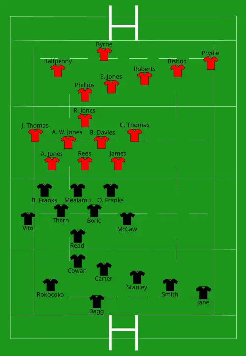 | Try: Hook 20' c Prydie 72' m A. W. Jones 77' c Con: S. Jones (2) 21', 77' Pen: S. Jones (3) 8', 18', 45' Drop: Hook 11' | Report | Try: Ndungane 30' m Potgieter 42' c De Jongh 59' c Con: Pienaar (2) 43', 59' Pen: Pienaar (4) 16', 23', 35', 74' Steyn 55' |