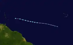 A tropical wave emerged off the western coast of Africa on July 17. Steered westward, a small area of low pressure developed in association with the wave two days later. Convection steadily increased and organized, leading to the formation of a tropical depression by 12:00 UTC on July 21. The depression failed to intensify into a tropical storm amid an exceptionally dry and stable environment and instead degenerated into a trough by 18:00 UTC on July 23 while located east of the Lesser Antilles.[43]
