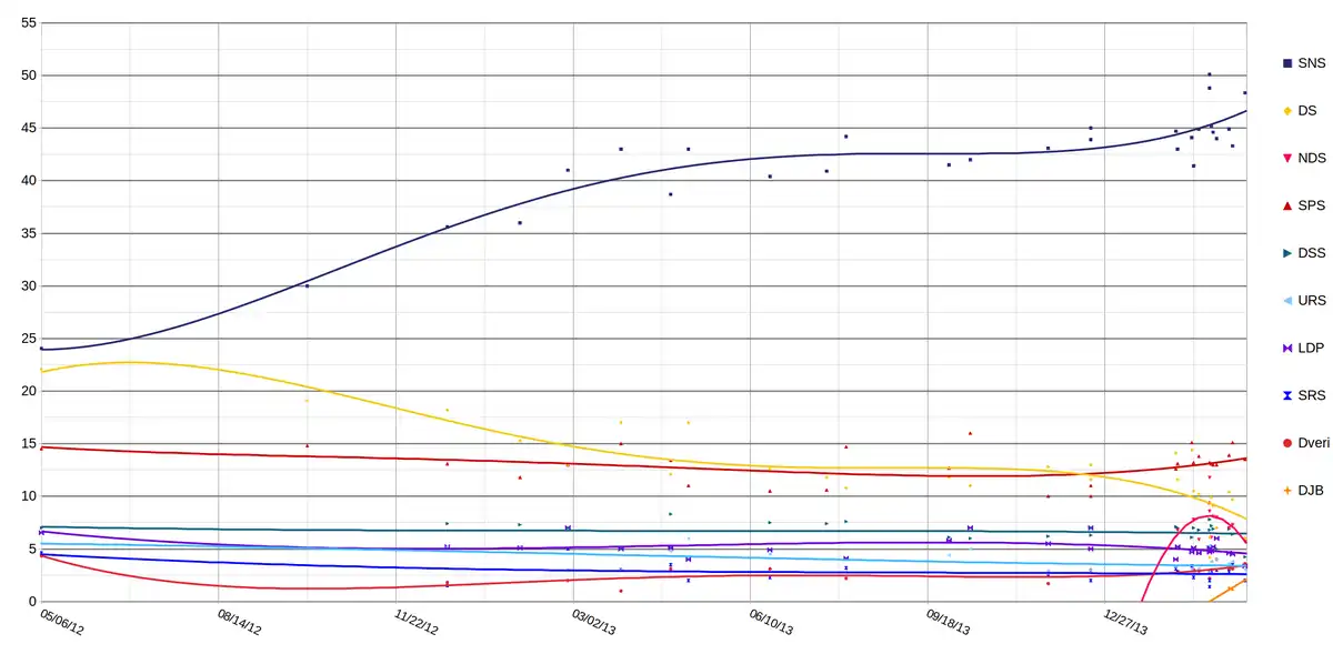 With SNS ratings at an all-time high and growing tension within the ruling coalition, first deputy PM Aleksandar Vučić called for early parliamentary elections to be held.[7] Some analysts believed that Vučić held the most influence in the government.[8] Despite speculation that he would not, prime minister Ivica Dačić agreed to hold early parliamentary elections.[9] On 29 January, President Tomislav Nikolić responded to the calls by dissolving parliament and scheduling early elections for 16 March 2014.[10][11]