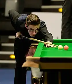 Martin O'Donnell defeated Sam Woollaston 3–1, before Woollaston won his next two matches 3–0, with three century breaks over Tom Ford to win the group on frame difference.[25][26] Luca Brecel won group A after defeating Ashley Carty, and drawing his other two games 2–2. When leading Mark Joyce 2–0, Brecel missed hitting a red ball on three occasions forcing him to forfeit the frame.[27] Ryan Day defeated reigning world champion Judd Trump in the opening match of group B, which he went on to win with two other draws. In the final match, against Barry Hawkins, Day needed to win one frame to go through to the final group, and won frame one with a break of 62.[27]