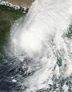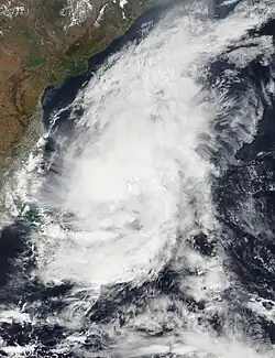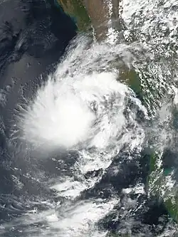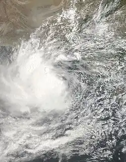 On 15 July, the JTWC started monitoring a disturbance west of Jafrabad, Gujarat, and it was unofficially designated as Invest 96A.[54] The disturbance substantially deepened, early on the next day, which prompted JTWC to upgrade it chance of formation to medium.[55] At 03:00 UTC of the same day, the IMD noted the disturbance and upgraded it to a tropical depression, becoming the first tropical depression of the season in the Arabian Sea.[56] It peaked as a depression, with maximum sustained wind speed of 25 kn (45 km/h; 30 mph) and a minimum barometric pressure of 992 hPa (29.29 inHg) after its initial stage of formation.[56] However, the system suffered from dry air intrusions as it moved away from the Indian coast.[57] By 18:00 UTC, the JTWC ceased tracking Invest 96A,[58] and on 18 July, the IMD issued its last warning, citing its weakening to a remnant low.[59]