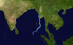 A fresh cyclonic circulation developed on early 19 May, over the Gulf of Martaban, due to the enhancement of the annual South-West monsoon over the basin.[44][45] By the evening, under the influence of that circulation, a low pressure system spawned over the same region.[45] At 18:00 UTC (23:30 IST), the JTWC also acknowledged that same circulation at the night of the same day.[46] By 00:30 UTC (06:00 IST) the JTWC published its TCFA for the system after it had rapidly consolidated its convective structure for the past few hours, and also formed a well-defined low-level center.[47] But eight hours later, the JTWC, cancelled it because its close proximity over land.[48] However, according to IMD, it rapidly consolidated into a well-marked low pressure area in the morning of the same day, and further into a depression at 11:30 IST (03:00 UTC), as it moved northeastwards, towards the south Burmese coast.[45] Between 08:00 UTC (13:30 IST) and 09:00 UTC (14:30 IST), the system made landfall over the southern Burmese coast, 30 km (20 mi) from Mawlamyine.[49] The system maintained its depression status as it travelled inland.[50][51] By 00:00 UTC (05:30 IST) the next day, the system finally weakened into a well-marked low pressure area over the Burma-Thailand.[52]