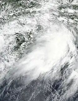 After the dissipation of Land Depression 01, a sudden surge of equatorial Rossby Waves and Kelvin Waves prevailed over the basin.[63] These two waves helped in a formation of another monsoonal low over Saurashtra and adjoining northeastern Arabian Sea on 10 August,[64] which later concentrated into a well-marked low pressure on 12 August.[65] The JTWC, on the same day, designated it as Invest 98A.[66] By 12 August, favorable conditions like high sea-surface temperature (SST), moderate wind shear and a strong pulse of MJO, helped for further concentration into a depression, but its center was sheared due to wind shear.[67] The JTWC soon followed the suit and upgraded it to Tropical Cyclone 03A.[68] However, as it moved westwards away from the Indian coastline, the wind shear increased significantly, which decayed its convective structure.[69][70] At 03:00 UTC (08:30 IST), the JTWC ceased issuing advisories to the system.[70] Nine hours later, the IMD followed the same, and downgraded the system to a remnant low.[71]