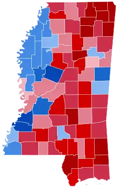 Trump received 60.9% of the vote in Mississippi, winning the state by a 22.9% margin. Harris received 15% less total votes than Biden did, in large part with a decline in turnout from black majority counties on the Mississippi Delta. Collectively, these counties saw a 8% drop in turnout compared to 2020.[25] Trump has flipped the majority black counties of Copiah, Issaquena, Jasper, Pike, Warren, and Yazoo, as well as Marshall and Oktibbeha counties.