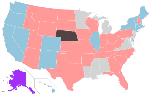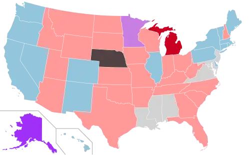 Prior to the election, Republicans controlled 56 legislative chambers, while Democrats controlled 41. Both chambers of the Alaska Legislature were controlled by bipartisan coalitions. The states of Arizona, Michigan, Minnesota, New Hampshire, and Pennsylvania were expected to hold the most competitive elections for legislative control.[2] Additionally, court-ordered redistricting in Wisconsin was expected to lead to Democratic gains in both chambers of the Wisconsin Legislature.[3] Favorable redistricting from Montana's independent redistricting commission was also expected to lead to Democratic gains in that state.[4]