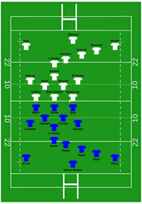 | Try: Penalty try 8' Jones 62' c Corrigan 79' c Con: O'Brien (2/2) 63', 79' | Report | Try: Vecchini (2) 25' m, 57' c Fedrighi 33' c Muzzo 69' m Con: Rigoni (2/4) 34', 58' Pen: Rigoni (1/1) 36' |
