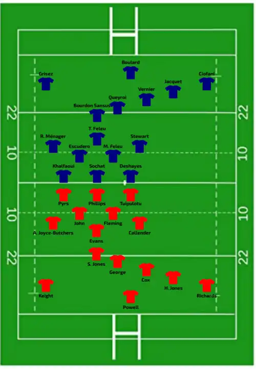 | Try: Sansus 3' c M. Ménager 32' c Fall Raclot 47' c Sochat 62' c Riffonneau 75' c Con: Queyroi (4/4) 4', 34', 49', 63' Bourgeois (1/1) 77' Pen: Queyroi (1/1) 38' | Report | Try: Wafer 71' c Dalton 78' c Con: O'Brien (2/2) 72', 77' Pen: Fowley (1/1) 14' |