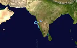 Under the influence of the tropical disturbance, a low pressure area formed over the eastern Arabian Sea off the southern Konkan-Goa coasts by 05:30 IST on 22 May.[3] By 05:30 IST on 23 May, it became a well marked low pressure area off the southern Konkan coast and persisted over the same region as of 08:30 IST.[4] The system organised into a depression by 05:30 IST on 24 May about 40 km northwest of Ratnagiri.[5] Over the next 6 hours, the depression moved slowly eastward at a speed of 5 km/h and between 11:30 and 12:30 IST it made landfall, crossing the south Konkan coast near Ratnagiri. The maximum sustained windspeed at the time was 25 knots (46 km/h) gusting to 35 knots (65 km/h).[6] The system then moved eastwards inland and[7] by 05:30 IST on 25 May, the system had weakened back into a well marked low pressure area over southern Madhya Maharastra and the adjoining regions of Marathwada and Karnataka.[8]