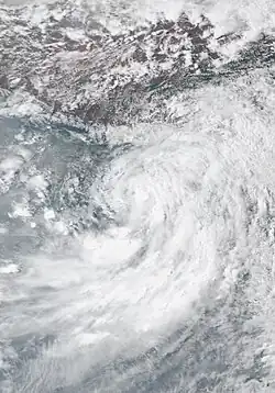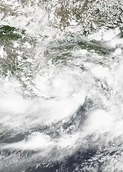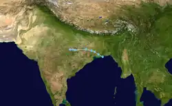 A low pressure area formed over northwest Bay of Bengal off the coast of Odisha at 08:30 IST on 27 May.[9] Favorable environmental conditions including warm sea surface temperatures, moderate vertical wind shear over the system and the presence of warm air over Gangetic West Bengal and Bangladesh allowed it to gradually consolidate. However, the strong wind shear in the region due to the advancing southwest monsoon and insufficient time over sea before landfall limited its intensification. It became well marked at 05:30 IST on 28 May and persisted over the same region.[10] By 05:30 IST on 29 May, the system coalesced into a depression near the coasts of West Bengal and Bangladesh.[11] Thereafter, the depression moved nearly northwards and by 08:30 IST on the same day, it intensified into a deep depression.[12] Over the next 6 hours, the system continued to move nearly northwards and made landfall on the West Bengal–Bangladesh coast between Sagar Island and Khepupara, close to Raidighi. Its maximum sustained windspeed at the time was 30 knots (56 km/h) gusting to 40 knots (74 km/h).[13] It then tracked north-northeastward inland,[14] and by 05:30 IST on 30 May the system had weakened back into a depression over Bangladesh.[15] By 17:30 IST on the same day, it had degenerated into a well marked low over Meghalaya due to interaction with rugged terrain.[16]
