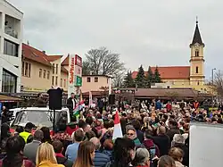 On 15 March, Magyar, despite initially refusing his participation in politics, held a rally attended by tens of thousands in Budapest at which he announced the formation of a new political party.[10] According to polling conducted that month, around 15% of voters claimed they were "certain or highly likely" to vote for Magyar if he ran for office.[11]