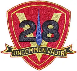 The 28th Marine Regiment (28th Marines) is an infantry regiment of the United States Marine Corps. The regiment (inactive since the Vietnam War), which is part of the 5th Marine Division, fought in the Battle of Iwo Jima during World War II. Six Marines of the 2nd Battalion, 28th Marines were featured in the historical photo by Joe Rosenthal of the U.S. flag raising on top of Mount Suribachi.[1]