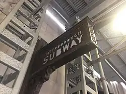 A second fare control area at the southern end of the southbound platform leads to a privately operated passageway in the basement of the New York Life Building, between 26th and 27th Streets.[25] It is only open from 7 a.m. to 7 p.m. on weekdays.[60] The New York Life Building entrance has an Art Deco inspired interborough subway sign hanging from the facade of that building.[4]: 8 [60][61]