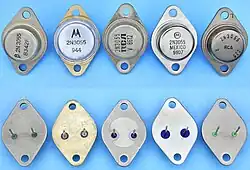 The 2N3055 is a silicon NPN power transistor intended for general purpose applications. It was introduced in the early 1960s by RCA using a hometaxial power transistor process, transitioned to an epitaxial base in the mid-1970s.[1] Its numbering follows the JEDEC standard.[2] It is a transistor type of enduring popularity.[3][4][5]