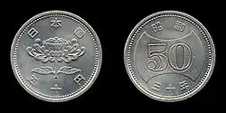 The 50 yen coin (五十円硬貨, Gojū-en kōka) is a denomination of Japanese yen. These coins were first minted in 1955, and concurrently circulated alongside a banknote denomination of the same amount. 50 yen notes were eventually pulled from circulation shortly before the center of the 50 yen coin was holed. The first yen coins were made of pure nickel and slightly larger than the ones used today. Changes to the 50 yen coin were made in response to events surrounding the 100 yen coin. The public wanted a different looking 50 yen coin while the mint wanted to stay consistent with the material used to make the coins. The current design was first minted in 1967 using Cupronickel rather than pure nickel.[1] The 50 yen coin continues to be minted for commerce, and is a collectible among hobbyists.