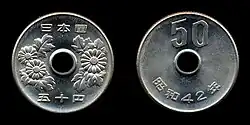 1. ^ 50 yen coin changes in 1967 include a reduction in diameter from 25 to 21 mm, and a weight change from 5 grams to 4. The size of the center hole was also reduced from 6 mm in diameter to 4.